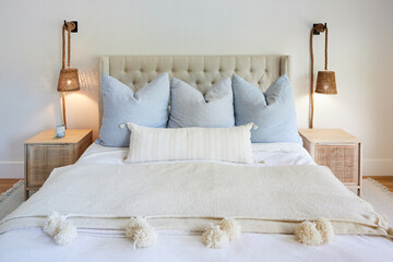 country interior design of modern bedroom with white and cream pillows on bed