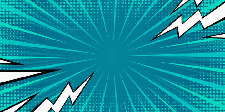 Comic Pop art light blue background with lightning flashes. Cute retro stripes pattern. Vector halftone illustration. For comic superhero text, speech bubble, message