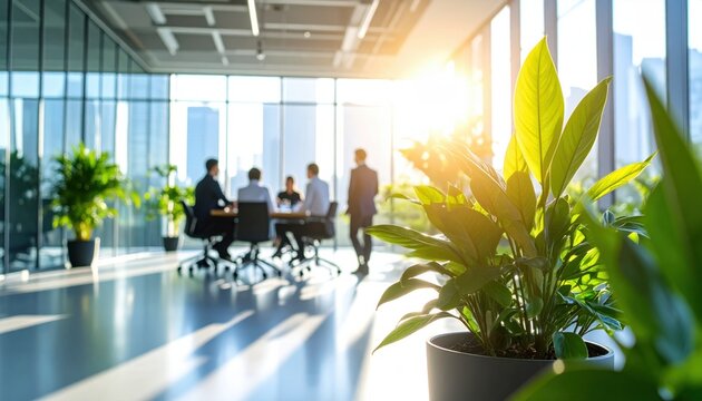 Bright and spacious office with blurred people walking and working in a modern business environment