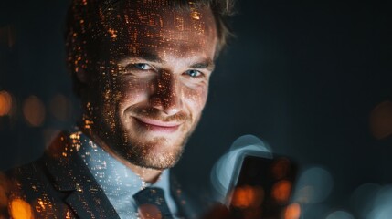 Business in focus: the engaging presence of a tech-savvy executive. Market analysis. Confident businessman in navy suit: elegance and assurance. Market forecast. Sales data.