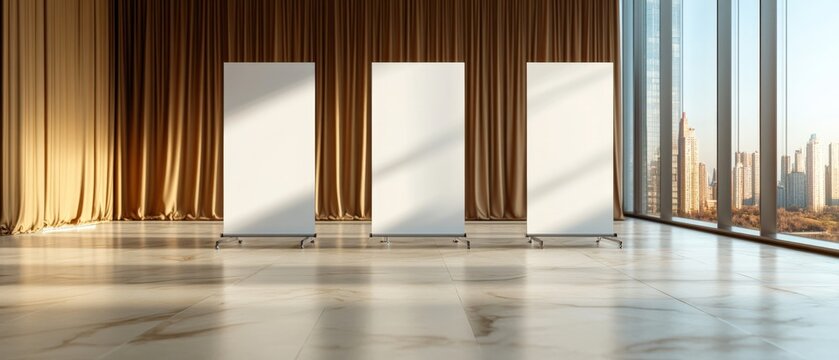 Mockup of a rollup banner in a contemporary office setting with a cityscape backdrop. Concept Mockup Design, Rollup Banner, Contemporary Office, Cityscape Backdrop