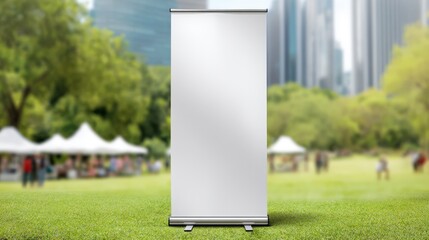 Blank Roll-Up Banner Stand Mockup in Outdoor Park Setting with Green Lawn for Advertising