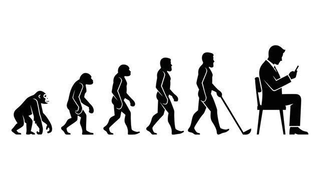 A visual representation of human evolution, depicting the progression from ape to modern man engrossed in technology.