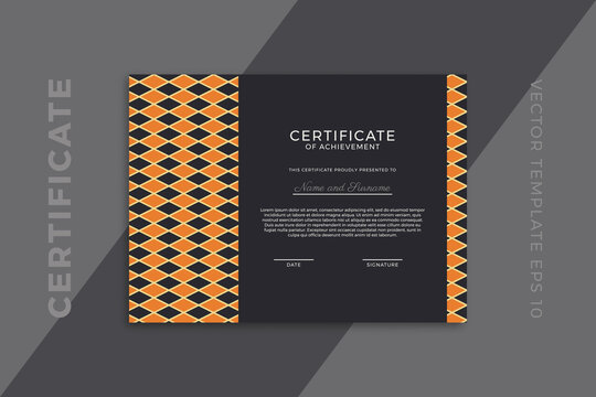 Modern business diploma mockup for graduation or course completion. Trendy horizontal certificate of appreciation dark template with geometric pattern. Vector background EPS 10
