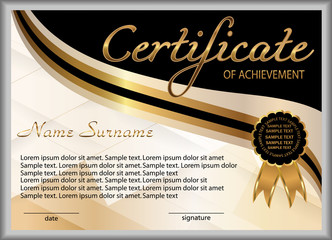 Certificate of achievement, diploma. Reward. Winning the competition. Award winner. Gold and black decorative elements. Vector illustration.
