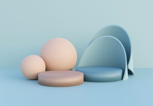 Blue and beige podium with abstract art objects. Stand to show products. Stage showcase with modern scene. Pedestal display with copy space in minimal style. 3D rendering. Studio platform template.