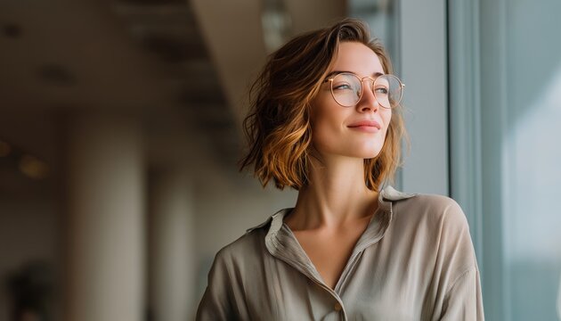 Stunning Businesswoman Enjoying A Break, Gazing Out The Office Window. A Refreshing Moment Amidst The Busy Workday.