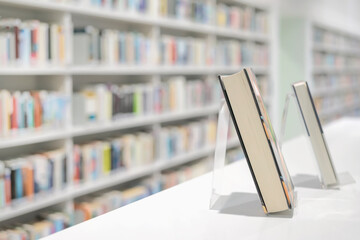 Bookstore with with blurred shelves and books on table, soft focus. Books displayed on acrylic stands in modern library . Education, school, study, reading fiction concept. For background, copy space