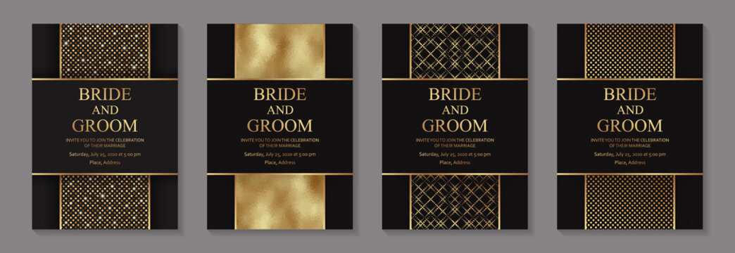 Modern geometric luxury wedding invitation design or card templates for birthday greeting or certificate or poster with golden glittering stripes on a black background.