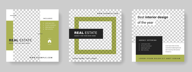 real estate editable social media layouts with green accent, simple and minimal graphic design for digital marketing, business purpose templates