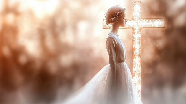 A minimalist First Communion background with a simple, elegant crucifix and a soft, radiant glow. Pale gold, white, and beige gradients create a serene, peaceful atmosphere, ideal for invitations.