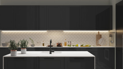 Elegant kitchen with modern white marble island, black cabinet counter, wooden cupboard, stove, sink, oven in sunlight from window for luxury interior decoration, cooking, dining product background 3D