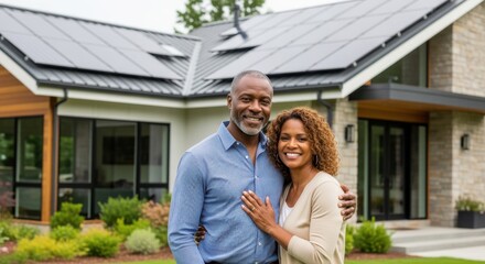 Mature black couple posing in front of a modern home equipped with rooftop solar energy system.