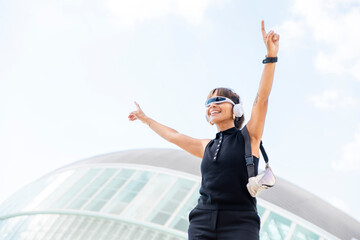 Businesswoman with headphones and futuristic glasses enjoying music in Valencia