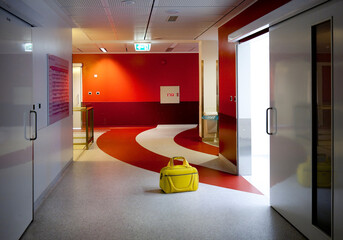 Detailed interior shots of a modern hospital lobby, showcasing the sleek design, comfortable seating areas, and welcoming atmosphere. Generative AI