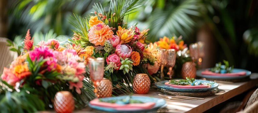 Elegant restaurant table close-up with gold cutlery, glass of water, and pastel flowers in small vase on dark marble surface – fine dining and modern minimal table setting