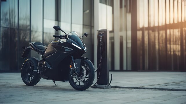Sleek black electric motorcycle parked near a futuristic charging station in an urban setting with modern architecture and soft golden sunlight