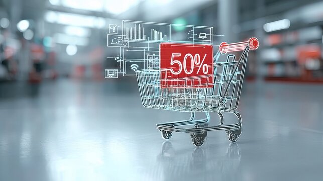 A shopping cart in a modern retail environment with a digital display showing a 50 discount promotion to attract customers and encourage sales