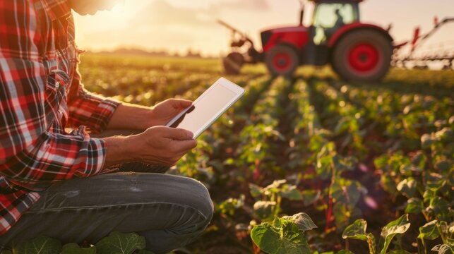 A farmer in a plaid shirt sitting in a field holding a tablet with a tractor in the background suggesting modern agricultural practices.