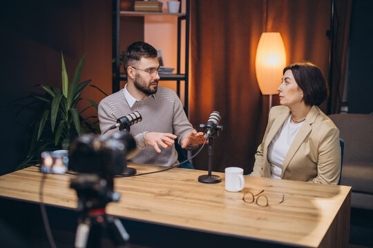 Man and woman collaborating as podcasters, recording engaging audio and video content in a modern home studio environment