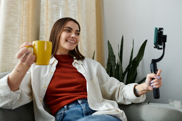 Woman recording video with knitted sweater
