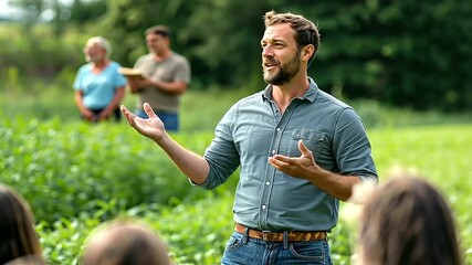 An agronomist speaking passionately at the front of a modern farm, teaching a workshop about agroecology and regenerative farming while hands-on demonstrations take place in the ba