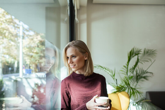 Happy woman holding coffee cup near office window