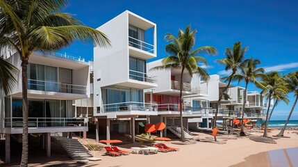 Wide shot of a stunning minimalist modernist villa, a luxury home perched on a cliff overlooking the ocean at sunset