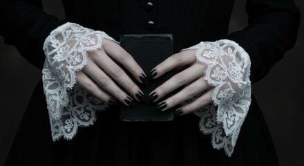 close up Gothic hands with lace cuffs holding black book
