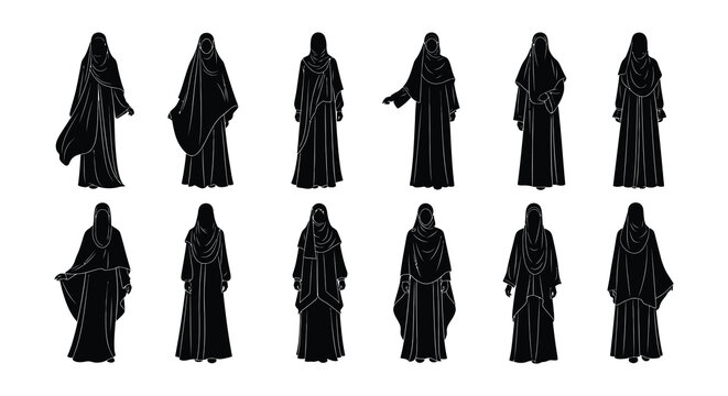 Silhouettes of women in traditional black niqabs and abayas a cultural representation