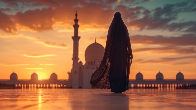 A Muslim woman in a niqab walking towards a big mosque, her figure silhouetted against the evening lights, back view