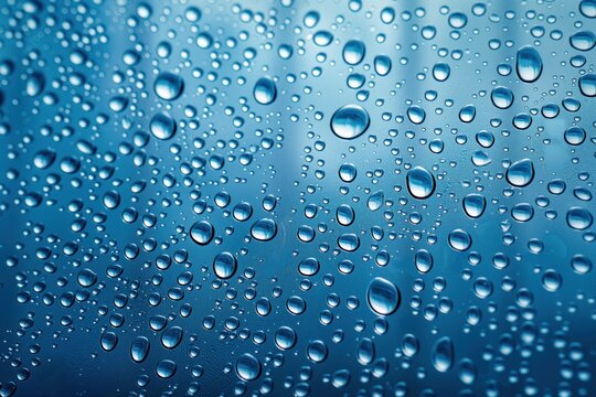Water droplets on glass surface, blue background, close-up. Clear, transparent water, condensation, liquid pattern, moist surface, wet glass, shiny, glossy, colorful, abstract, macro shot, nobody