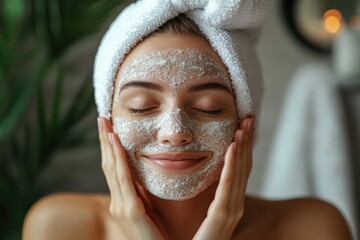 Face Scrub. Skincare Concept. Woman Applying Organic Face Scrub in Stylish Bathroom