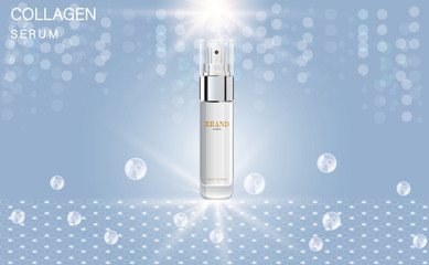 Vector banner with realistic set of bottles and jars for face mask, hand cream, body lotion, hair spray on blue background with shining pearls. Cosmetic products series for skin care and treatmen