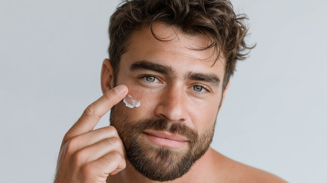 Man applying moisturizing cream on face close up, skincare routine for healthy skin with beard and mustache, natural beauty care for men
