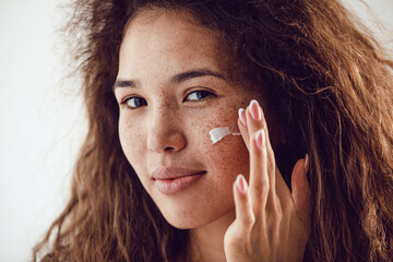 Portrait of woman with curly hair and freckles applying moisturizer to her face.
