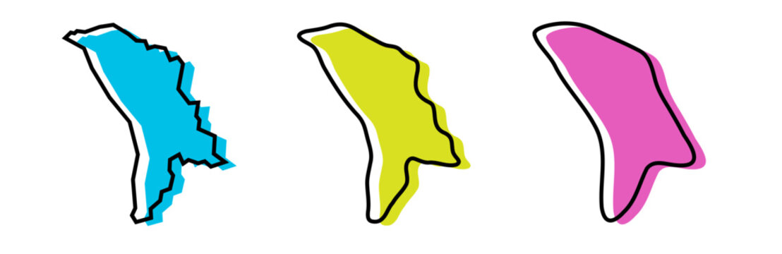 Low polygonal map of the Republic of Moldova (Republica Moldova) with sign Moldova, both in warm colors of red, purple, orange and yellow; sovereign small landlocked country in Eastern Europe
