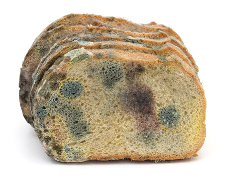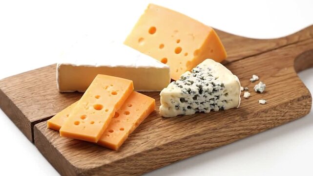 Close-up of moldy cheese slices on kitchen countertop, matured flavor