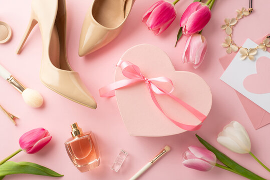 8-march concept. Top view photo of pink heart shaped giftbox tulips beige high heel shoes envelope with letter necklace cosmetic brushes barrette and perfume bottle on isolated pastel pink background