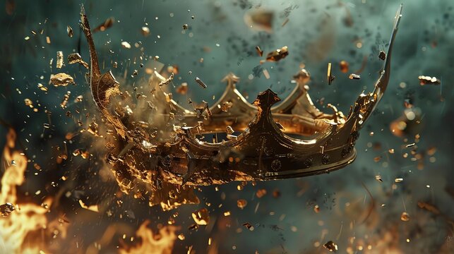 medieval golden crown shattering into pieces symbolizing the fall of a powerful monarchy digital art