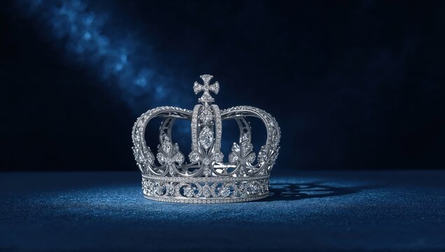 Luxury diamond royal crown on blue velvet background highlighted by soft dramatic light, symbolizing prestige and elegance