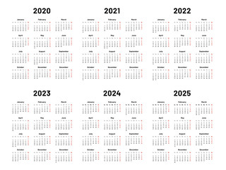 Calendar grid. 2020 2021 and 2022 yearly calendars. 2023, 2024 years organizer and 2025 year weekdays. Business planner, day graphic planning calendar isolated vector illustration set