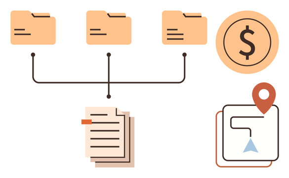 Folder network with documents, monetary icon, and navigation map suggests streamlined data management. Ideal for finance, organization, documentation, workflow, navigation, planning business