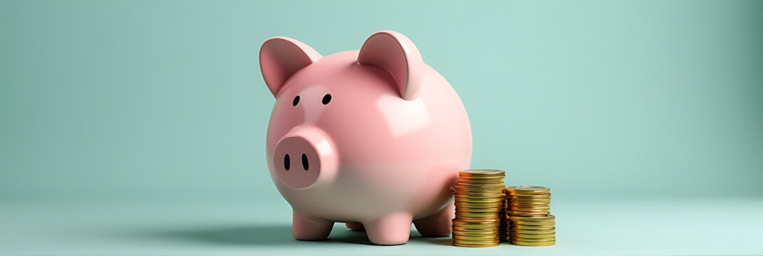In an office setting, a man diligently places a banknote into a pink piggy bank, managing his finances and organizing his savings on the desk