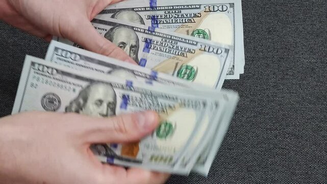 Person counting dollar banknotes in hands. Close-up view of cash counting process. Financial management and money concept.