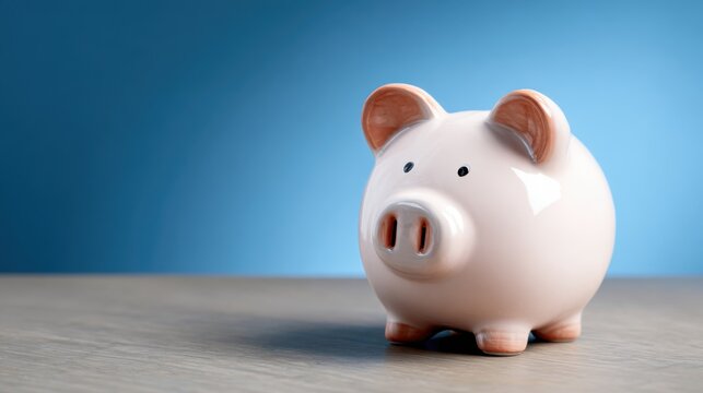 Piggy bank sits on a wooden table against a blue background, symbolizing saving money and financial planning
