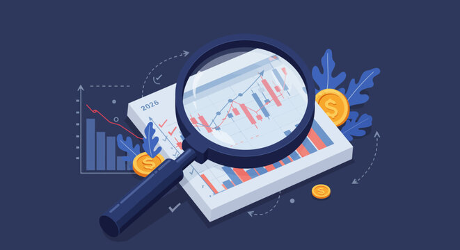 3d magnifying glass analyzing financial graphs with coins and trend arrows