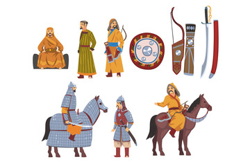 Mongol Nomad Warriors in Traditional Clothing with Weapon Collection, Central Asian Characters Vector Illustration