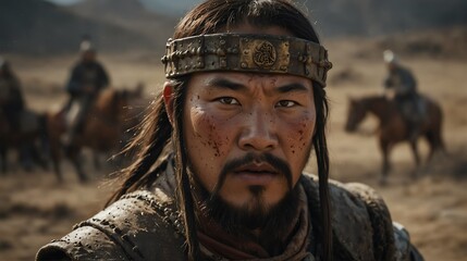 a mongol warrior portrait on middle of a battle ground fight from Generative AI