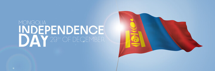 Mongolia independence day vector banner, greeting card. Mongolian wavy flag in 29th of December national patriotic holiday horizontal design
